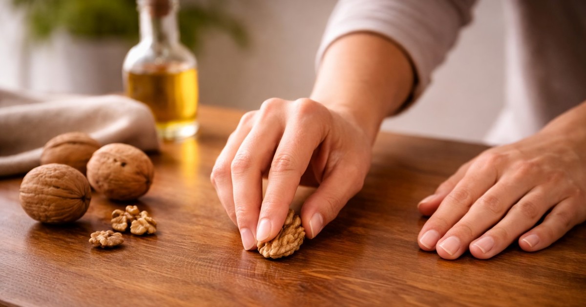 Un método sencillo y económico para disimular rayones en muebles de madera utilizando nueces. Los aceites naturales de este fruto seco ayudan a igualar el color y restaurar la apariencia de la madera.