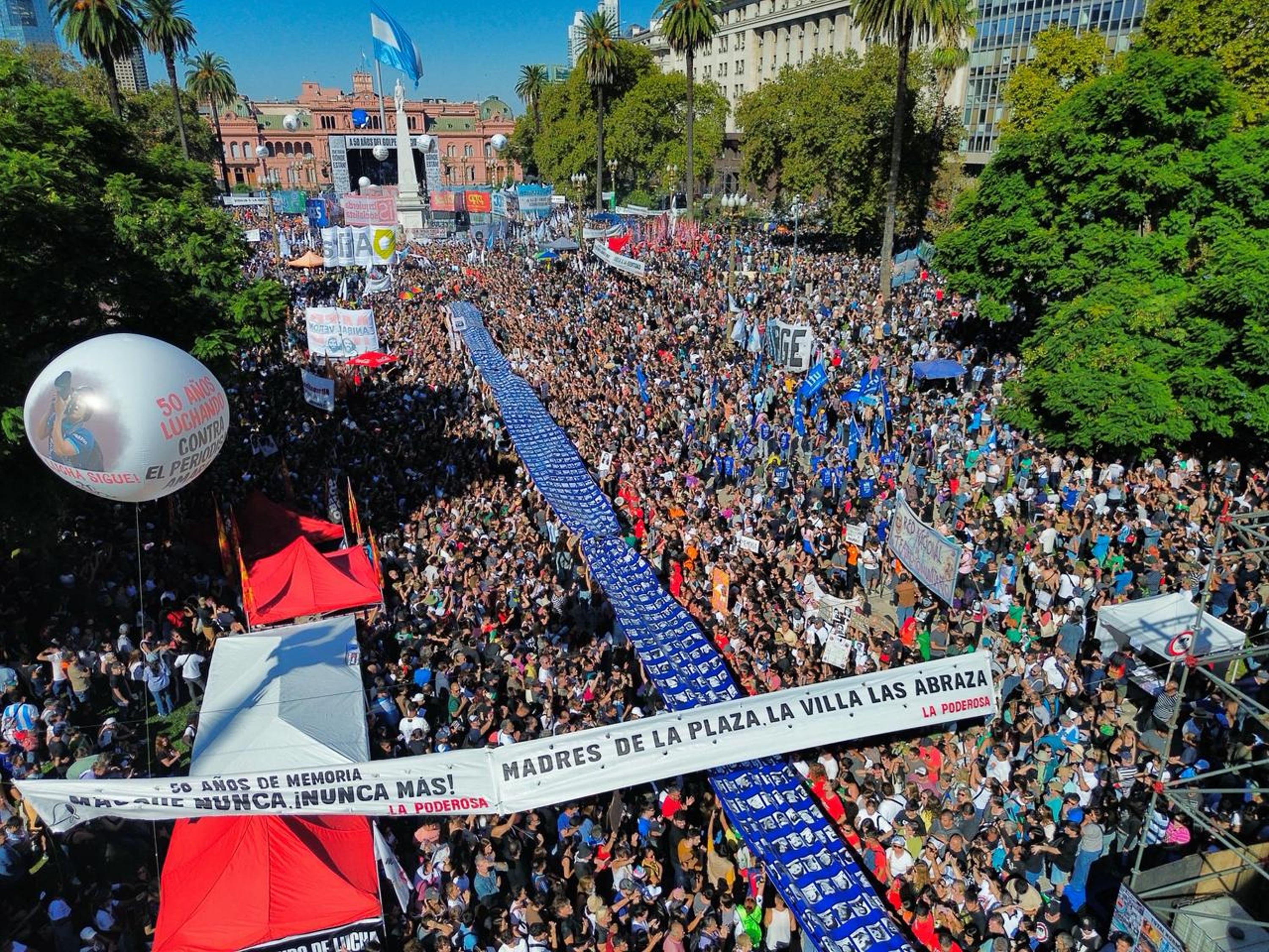 La ex presidenta Cristina Kirchner recibió a la columna de La Cámpora frente a su domicilio. La agrupación marchó desde la ex Esma a Plaza de Mayo en conmemoración del 50° aniversario del golpe de Estado.